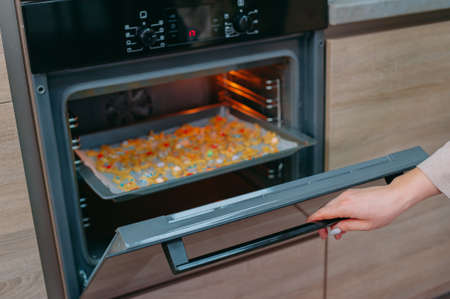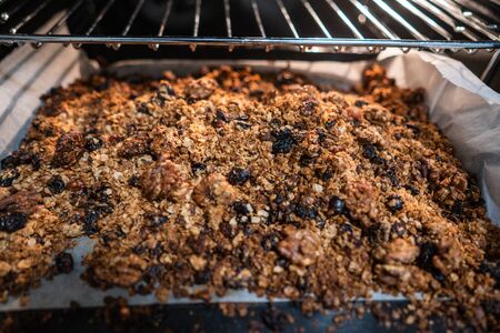 granola to cook in an electric oven. concept of simple ingredients for healthy breakfast