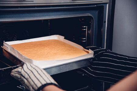 A woman puts a sponge cake in the oven to bake it