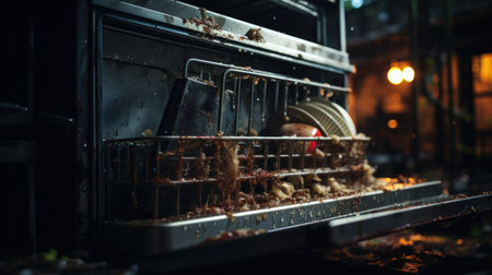 A dirty dishes are sitting in a dishwasher with water running down the sides, AI