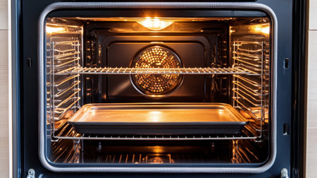 sparkling clean oven interior with light on, created with generative ai