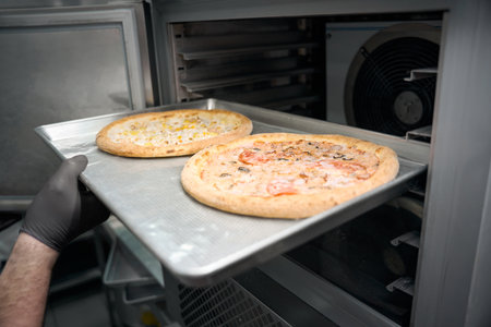 Employee of the semi-finished products workshop sends pizza to freezer