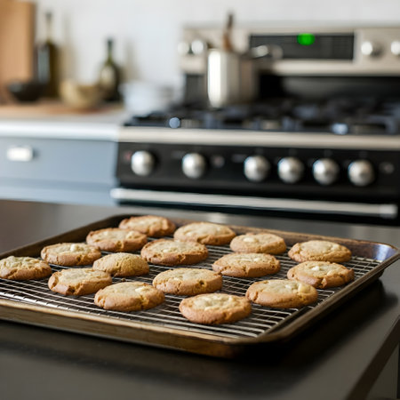 Golden cookies rest on a cooling rack inside a cozy oven, inviting anticipation with their fragrant aroma and homemade charm.