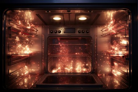 An open oven interior is the main subject. The image displays the interior structure featuring racks and a prominent fan. Warm lighting creates a sense of depth and the background hints at an indoor environment. Suitable for illustrations related to cooking, appliances, or home design for various uses.