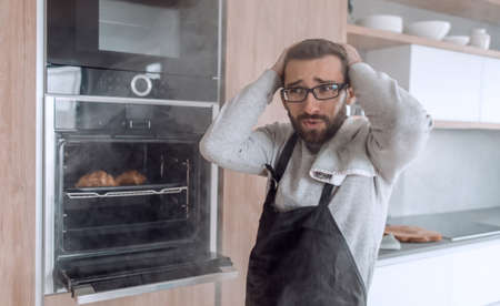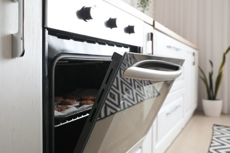 Close-up muffins ready to get out of electric oven. Concept of cooking home cake. Tasty food.