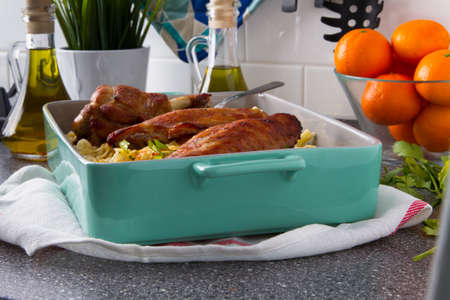 Oven temperature for cooking in a new gas oven. Chicken baked in the oven in a glass pan. Homemade food.