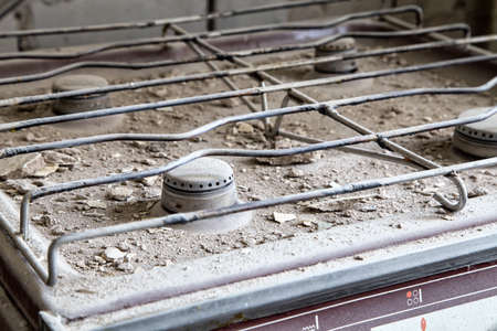 Close up White dirty knobs with drops of fat. Knob dial of control panel gas stove for on off or adjustment burn flame and temperature. Blaze, burner. Cleaning company concept. Selective focus. Side view.