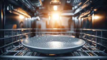 A detailed view of a modern oven interior, featuring a bright light and a shiny roasting tray, perfect for culinary enthusiasts or kitchen renovation projects.