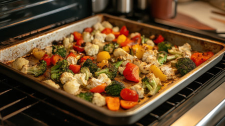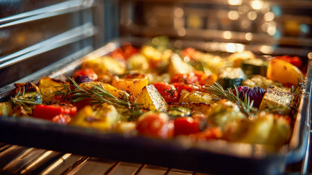 A tray of colorful vegetables roasting in an oven, showcasing a healthy and delicious meal preparation process. The vibrant colors and textures create an appetizing visual.