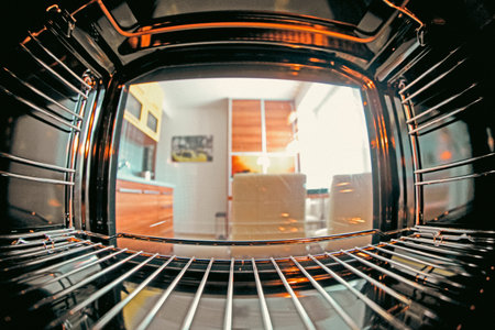 View from inside an empty modern oven looking out into bright contemporary kitchen interior, clean cooking appliance ready for baking or roasting