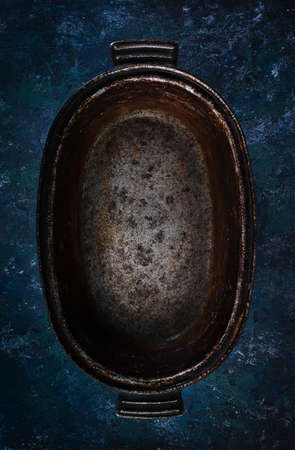Vintage Cast iron pan for baking goose or duck on rustic black blue stone cooking background, close up. Empty black frying pan frying skillet with copy space
