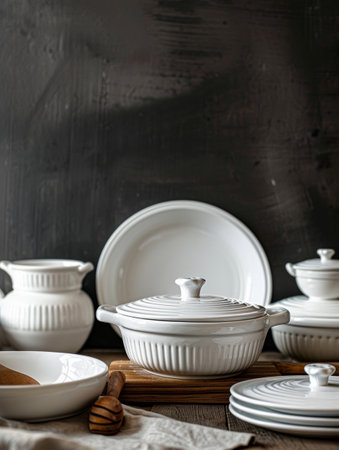 Close-up of white ceramic kitchenware on a wooden table: serving dish, casserole with lid, pitcher, stacked plates.