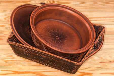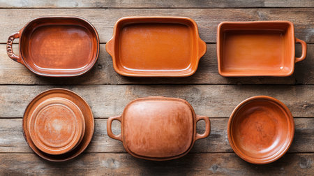 A flat lay of terracotta cookware, including a pot and a baking dish, arranged on a rustic wooden surface.