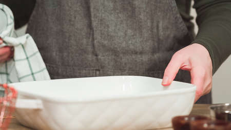 Flat lay. Step by step. Pouring homemade chocolate ice cream into a baking pan.