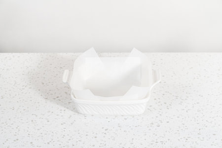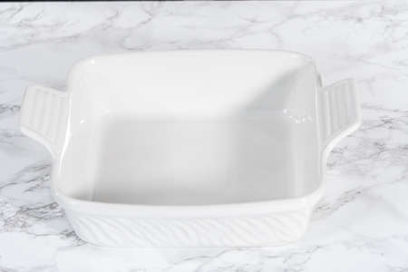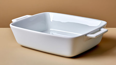 A sleek and modern white ceramic baking dish featuring sturdy handles, ideal for culinary use and perfect for showcasing dishes in an elegant kitchen environment.