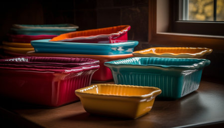 Vibrant colors of crockery stack in kitchenware department generated by artificial intelligence