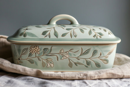 Stacked empty one rectangular and one round with removed lid roasters made with natural safe red clay with floral decor on a rustic table