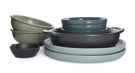 A stack of dishes. colored dishes on a natural wooden table. multi-colored cups and bowls.