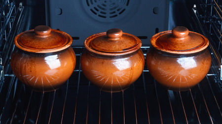 Traditional rustic home vegetable ragout in three clay pots in hot modern oven