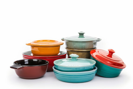 A collection of colorful enamel-coated pots and pans on a kitchen shelf, adding a vibrant and decorative touch to a well-organized cooking space.