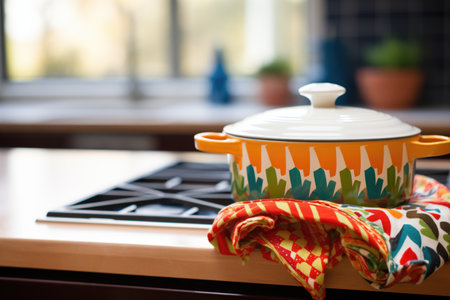 A vibrant arrangement of colorful cast iron cooking pots set against a striking patterned background, showcasing a modern kitchen aesthetic and culinary creativity.