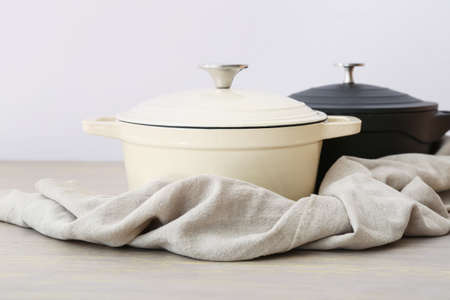 Kitchen utensils enamelware, utensils for cooking new clean enameled steel pans of a beautiful green color stand hardly on a shelf on a light wooden background with copy space for text
