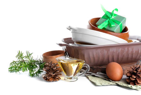 dishes and kitchen accessories for baking on the Kitchen table on a white background Copy space