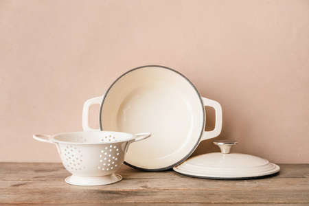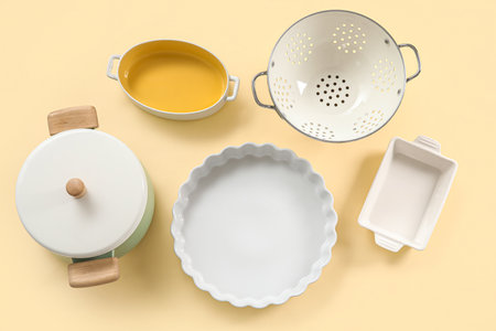 Top view of empty ceramic soup bowl isolated on beige background. empty ceramic pan. Flat lay of utensils for cooking