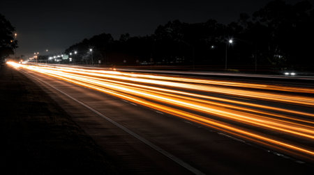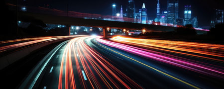 Captivating nighttime long exposure photograph capturing vibrant light trails from vehicles on a busy highway, illustrating dynamic motion and urban energy.