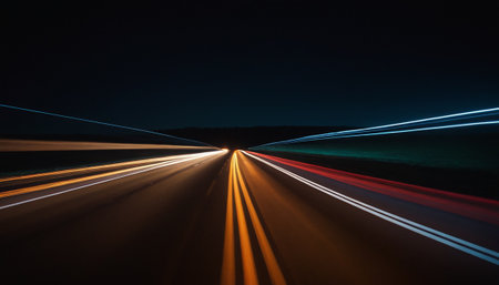Nighttime highway lights create dynamic streaks of color in a long exposure shot, showcasing fast-moving vehicles along the road