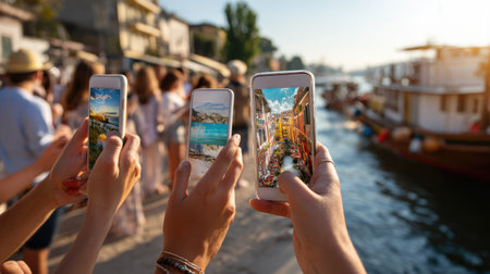 A lively scene of tourists capturing the beauty of a colorful waterfront with their smartphones during sunset. The warm golden light enhances the picturesque moment.