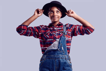 Sensual portrait of glamor elegant black hipster girl with short hair in a plaid shirt, denim overalls and fashion hat posing on colorful background in studio