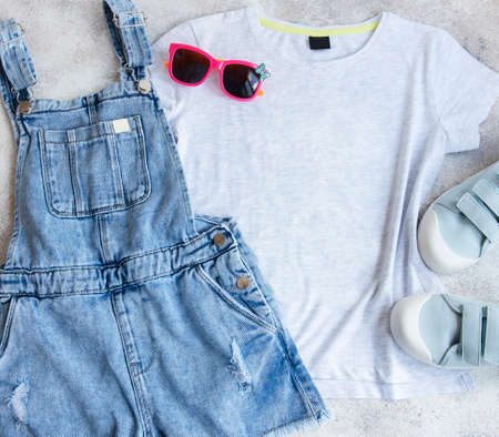 Top view of toddler girl bright jeans overall and leather flip flops on white background