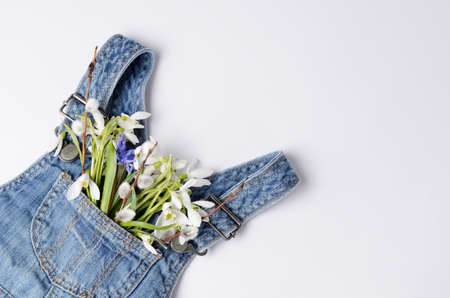 Snowdrop flowers bouquet in a jeans kids dress pocket. Creative layout for spring festive theme.