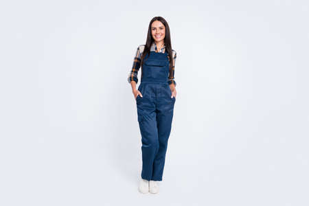 Full size photo of happy smiling good mood charming woman builder constructor isolated on white color background