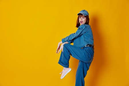 Pretty young female denim cap red lips glamor fashion studio model unaltered