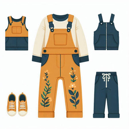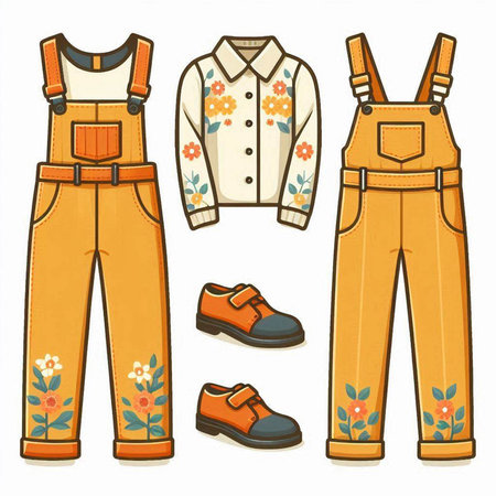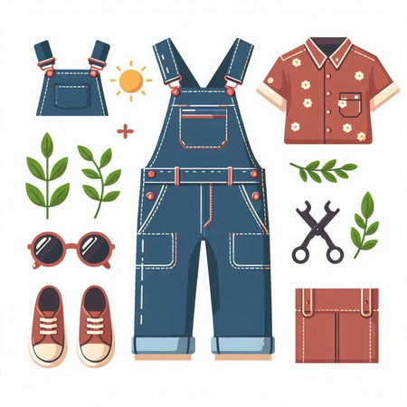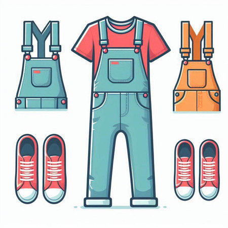 Dungarees and accessories. Set of vector icons in flat style.
