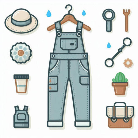 Set of overalls and accessories for work in the garden. Vector illustration