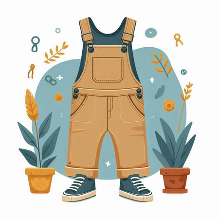 Jeans overalls, shoes and flower pot. Vector illustration.