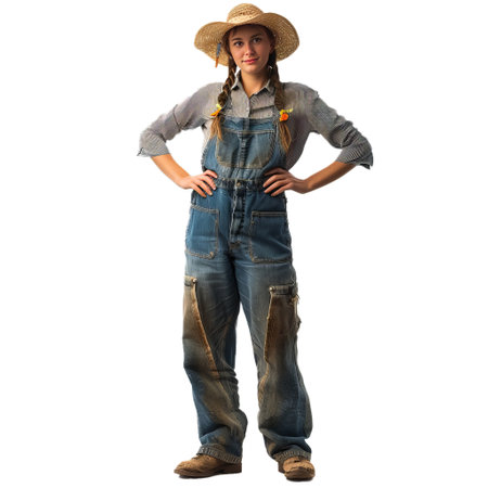 An AI generated illustration of a young woman wearing a denim jumpsuit isolated on a red background