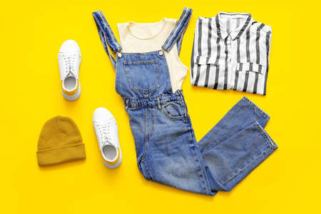 Stylish clothes and shoes on color background