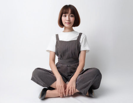 asian woman sitting full body of cute bob hair brunette on white background