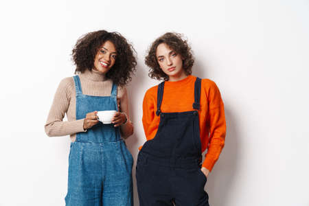 Portrait of two multinational women in overalls looking at camera and holding cup isolated over white background