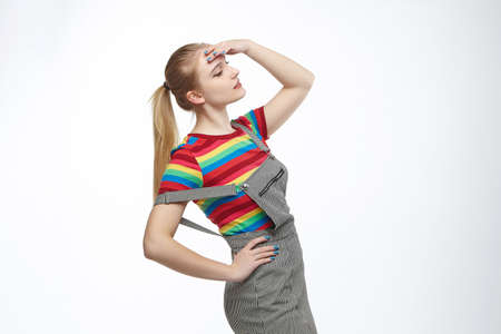 Girl in dungarees poses for photo shoot against white background