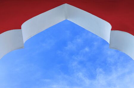 Red architectural structure with circular opening and blue sky with white clouds, abstract modern art concept
