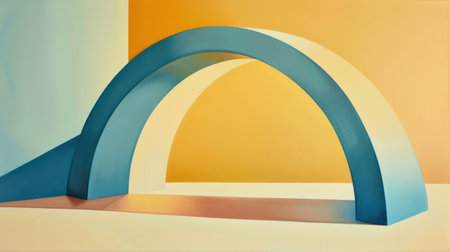 An abstract, minimalist painting of a blue archway resting on a white surface. The archway is set against a background of a yellow wall with sunlight shining through. The painting creates a sense of depth and space, with a subtle gradient of colors.