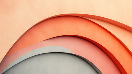 Arcs in soft muted coral and mint hues are arranged in layered formations, enhancing the aesthetic appeal of a modern space, inspiring creativity and tranquility.