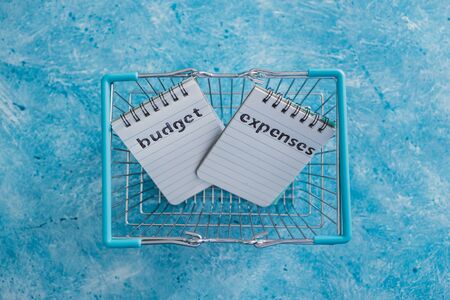 managing money and finance concept, budget and expenses notepads side by side on blue desk with shopping basket