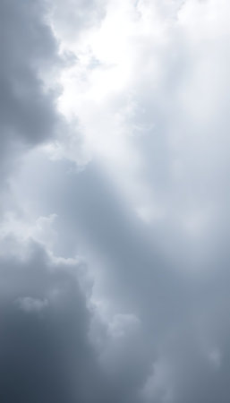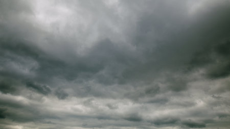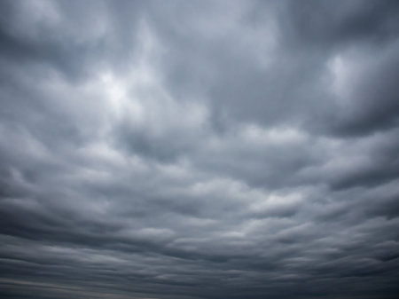 Dense showing dramatic overcast sky filled with dark gray cumulus clouds creating a moody and ominous atmosphere with subtle light breaking through the dense cloud...