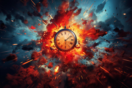 A close-up image of a pocket watch frozen in time, suspended in a fiery and smoky explosion.