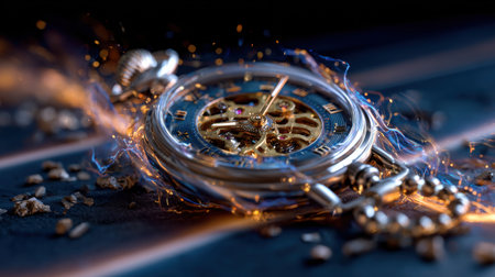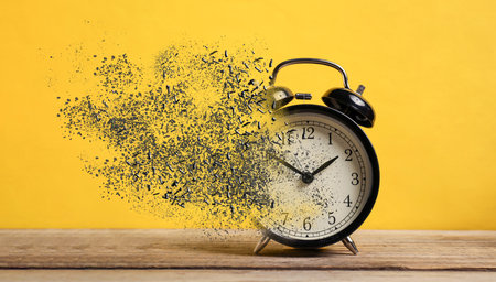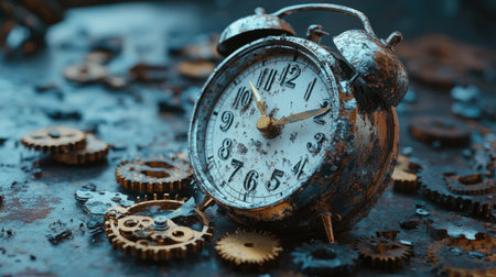 A broken alarm clock with scattered gears, highlighting the fleeting nature of time. The image conveys urgency,